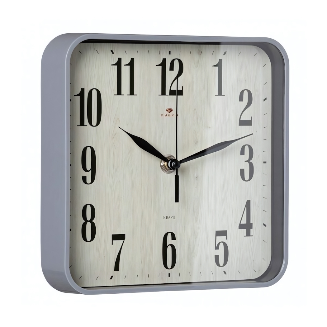 Размеры: 19 × 19 см; цвет корпуса: серый; материал корпуса — качественный, устойчивый к износу пластик/металл; циферблат — белый с текстурой, имитирующей древесину; стрелки — чёрные; механизм — тихий кварцевый.