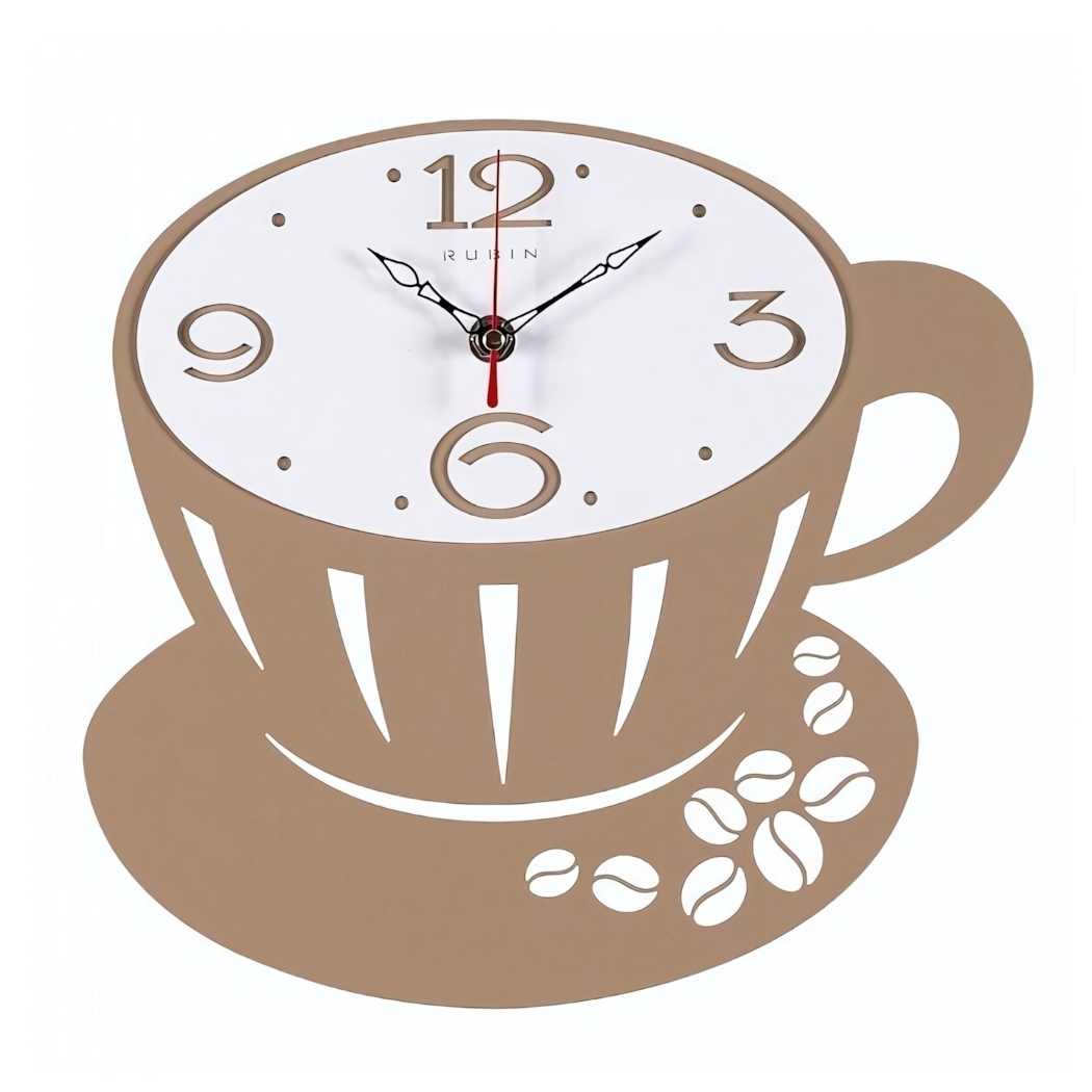 Часы идеально подойдут для размещения на кухне или в кафе, подчеркивая кофейную тематику. Они легко читаются благодаря белому циферблату и четким цифрам, выполненным в бежевом цвете. Черные и красные стрелки добавляют контраст и делают время видимым с любого расстояния.
