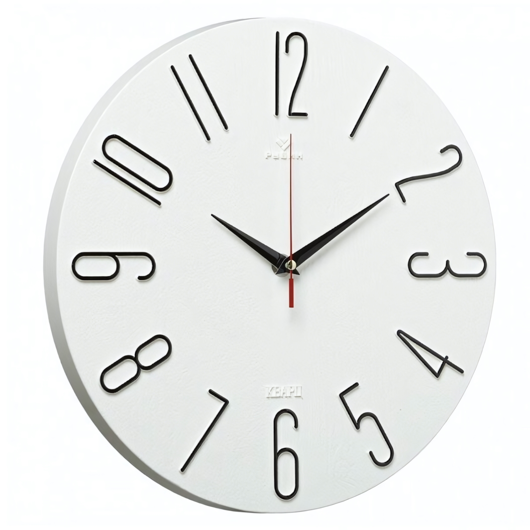 Корпус комбинирует белый и черный цвета, циферблат белый, стрелки черные и красные, цифры объемные и стилизованные, материал пластиковый. Диаметр изделия — 30см. Часы отгружаются без дополнительных аксессуаров, модель "Классика" выделяется универсальностью и простотой установки. Создайте уют в вашем пространстве с надежным помощником для точного контроля времени.