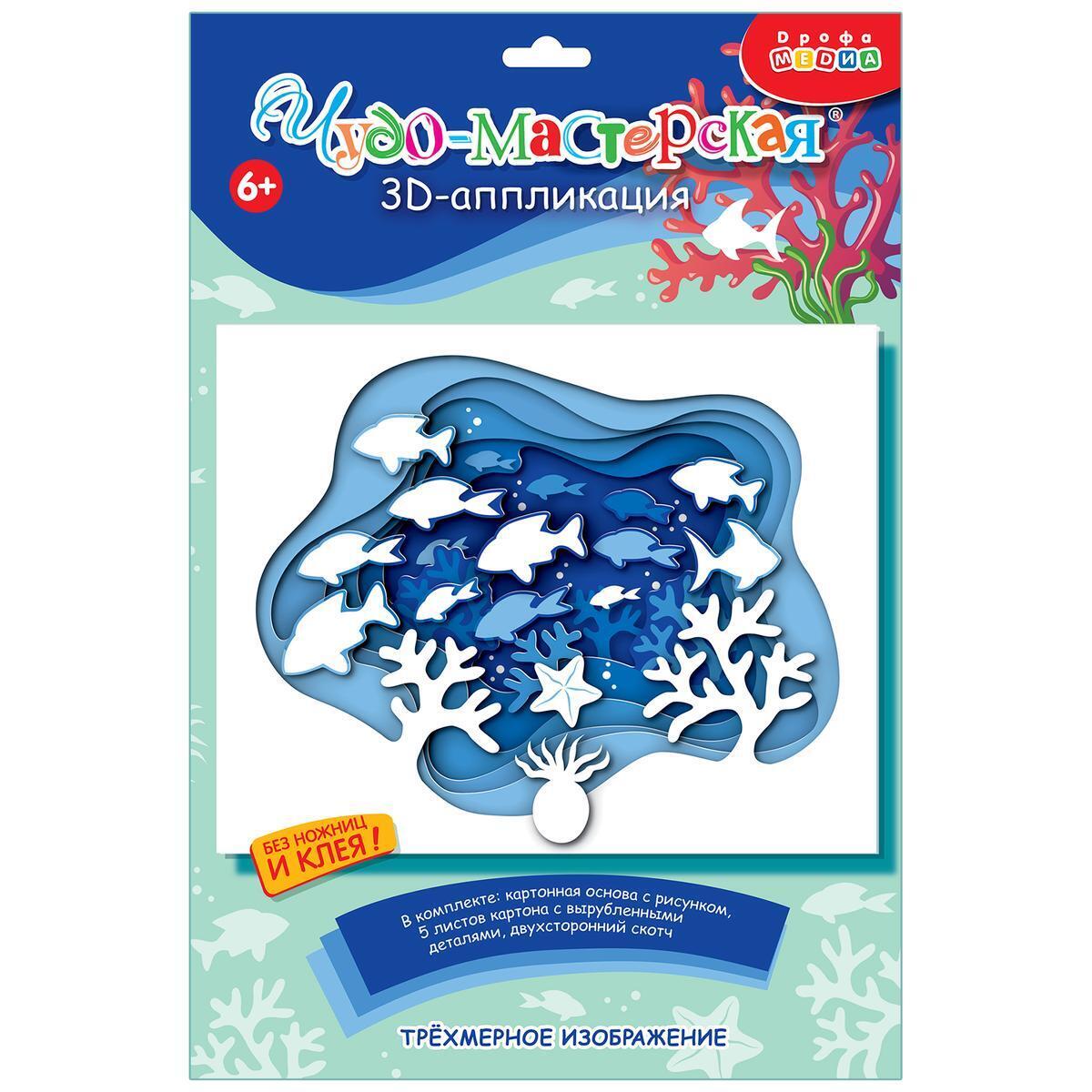 Набор для творчества «Подводный мир» от Дрофа-Медиа позволяет детям от 6 лет создавать красочные 3D-аппликации без использования ножниц и клея. Готовые элементы из плотного картона легко крепятся на основу с помощью объемного скотча, формируя многослойную композицию с эффектом глубины.