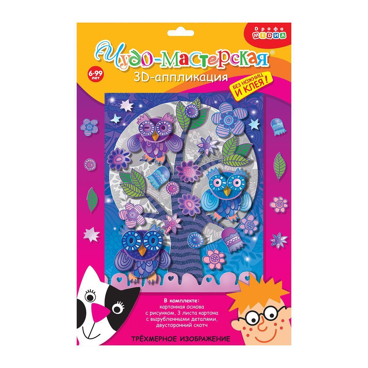 Набор для творчества «Совы на ветке», 3D-аппликация 20х25 см, картон, без ножниц и клея