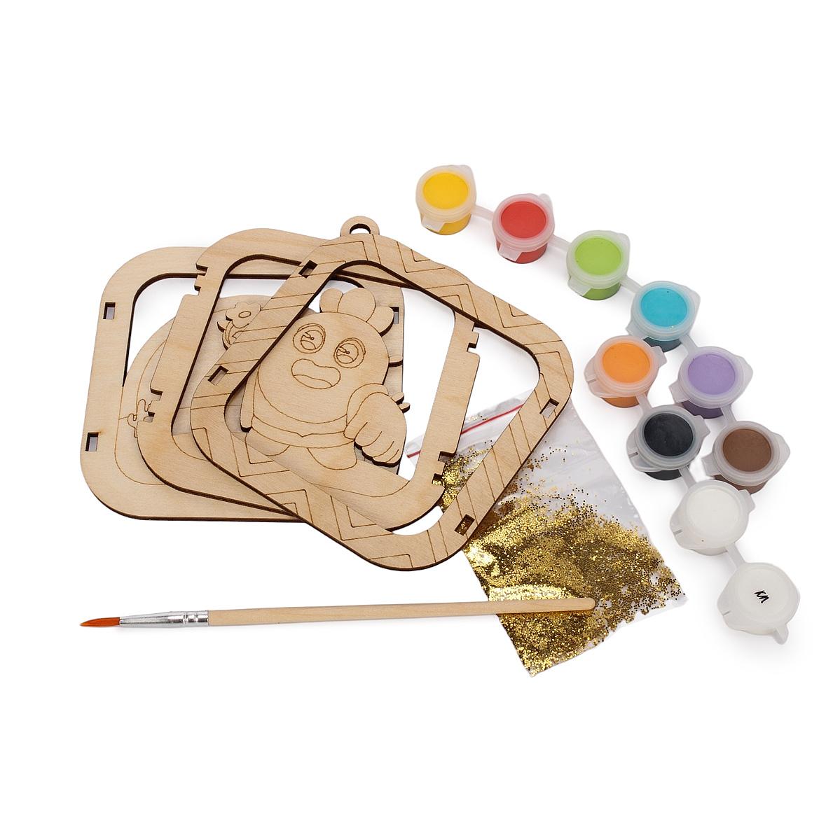 В набор входят: деревянные заготовки, кисть, 10 баночек с краской различных цветов и пакетик с блестками. Все материалы безопасны и легко очищаются. Размеры деталей не указаны, но они идеально подходят для создания подвески, которая станет ярким акцентом в вашем интерьере.
