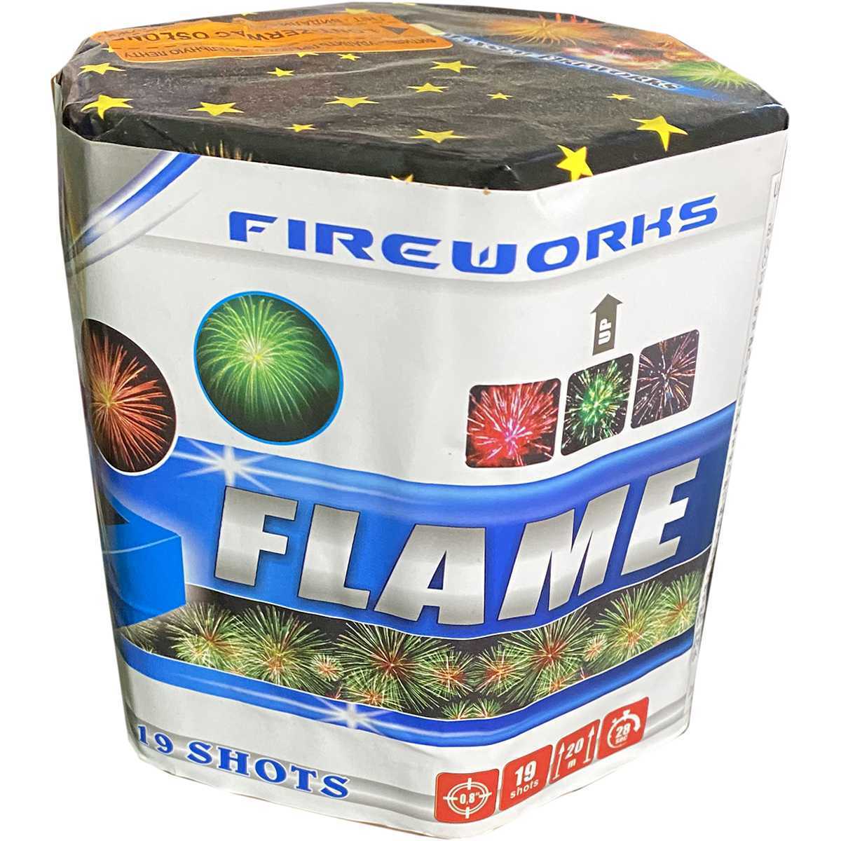 Размеры батареи составляют 0,8 дюйма по диаметру и 19 дюймов в высоту. Упаковка выполнена в белом цвете с синими и черными элементами, что делает её привлекательной и заметной. На лицевой стороне упаковки вы найдете яркую надпись «FLAME» и изображение трех видов фейерверков, что добавляет визуального интереса.