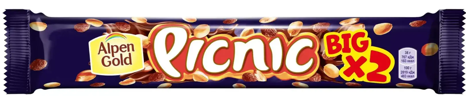 Шоколадный батончик "Picnic Big x2" - это идеальное сочетание хрустящего печенья, нежной карамели, орехов и изюма, покрытых толстым слоем молочного шоколада. Двойной размер для настоящих гурманов!
