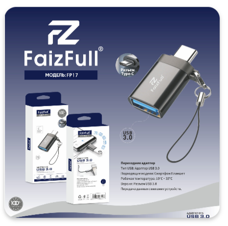 Этот компактный адаптер-переходник FaizFull FP17 станет вашим надежным помощником в передаче данных между устройствами с разъемами Type-C и USB 3.0. Его металлический корпус обеспечивает долговечность и защиту от повреждений.