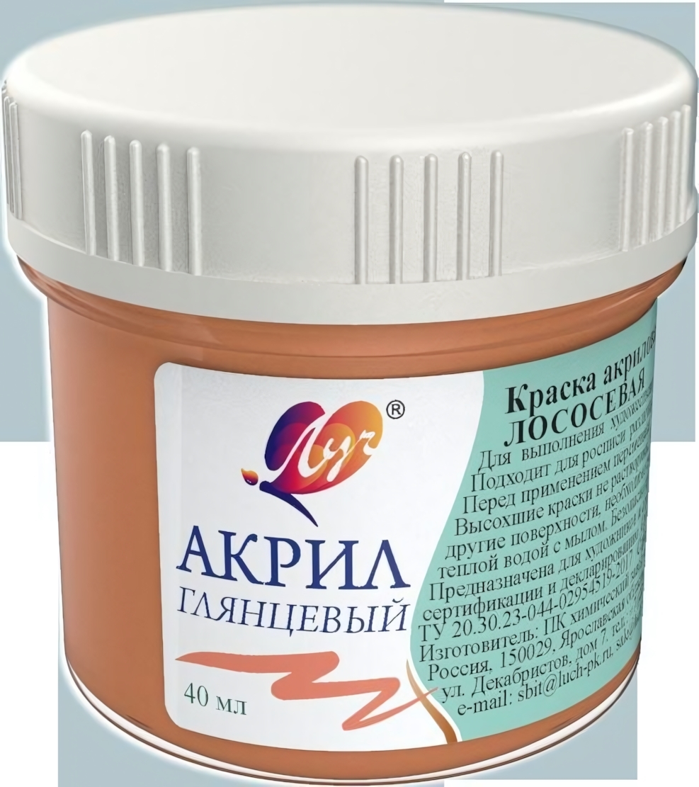 Объем банки составляет 40 мл, что позволяет вам использовать краску долгое время. Лососевый цвет добавит нежности и тепла вашим работам, а глянцевая поверхность придаст им особый шарм. Не упустите возможность сделать ваши художественные проекты более выразительными и яркими с помощью нашей акриловой краски!