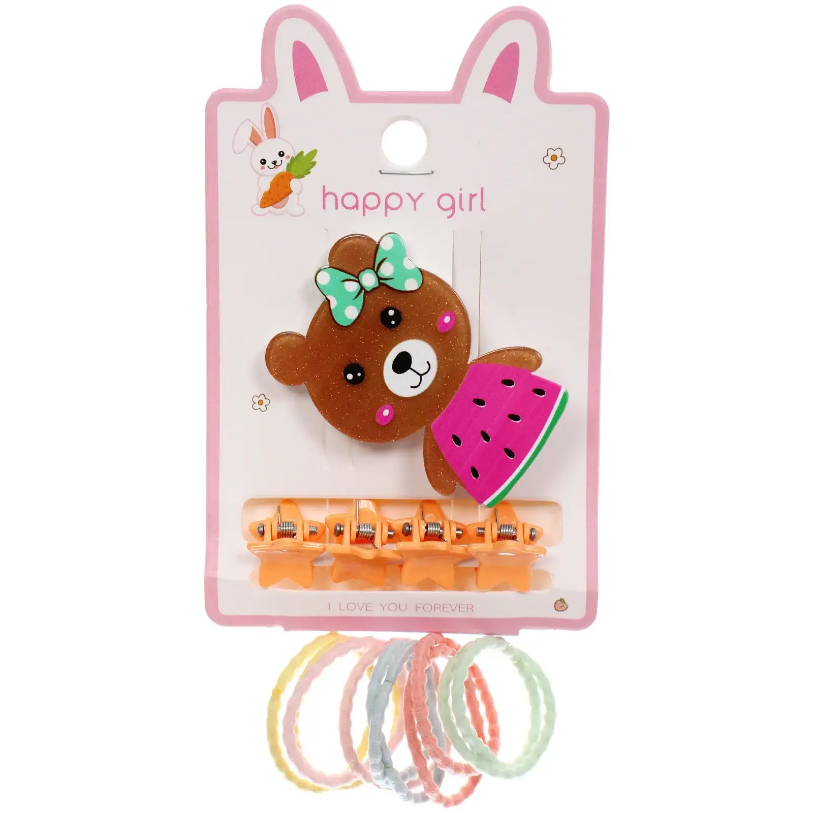 Размер заколки составляет 11*7 см, что делает ее удобной для использования. В набор входят 4 краба и 10 резинок, выполненных в пастельных цветах: желтом, розовом, голубом, зеленом и белом. Упаковка оформлена в светло-розовых тонах с изображением кролика и надписью «I LOVE YOU FOREVER», что делает ее отличным подарком для маленьких модниц.