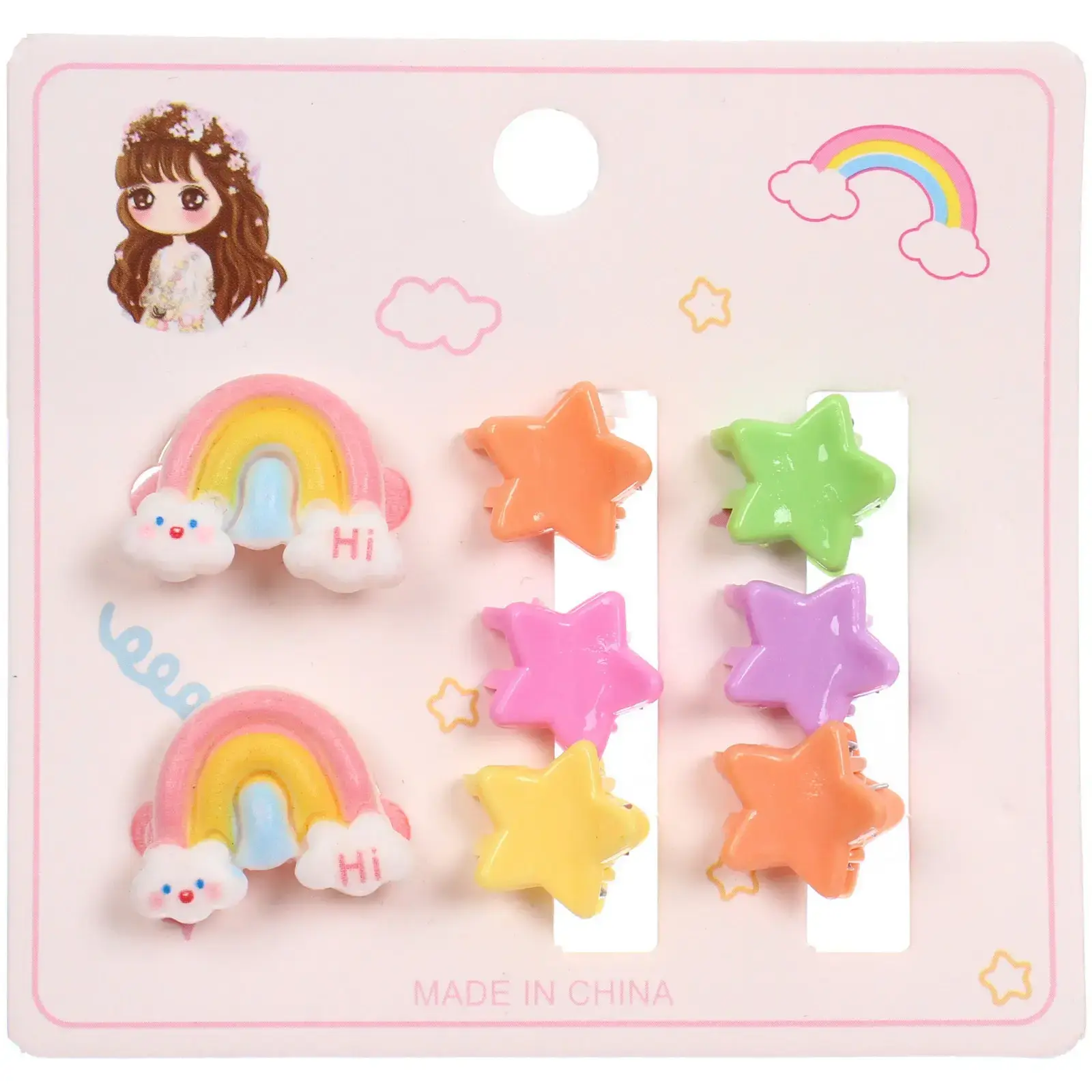 Размеры заколок составляют 8.5*8 см, что делает их компактными и удобными для хранения. Набор представлен в красивой упаковке с изображениями облаков и радуги, что делает его отличным подарком для маленьких модниц. Не упустите возможность порадовать своих детей стильными аксессуарами для волос!