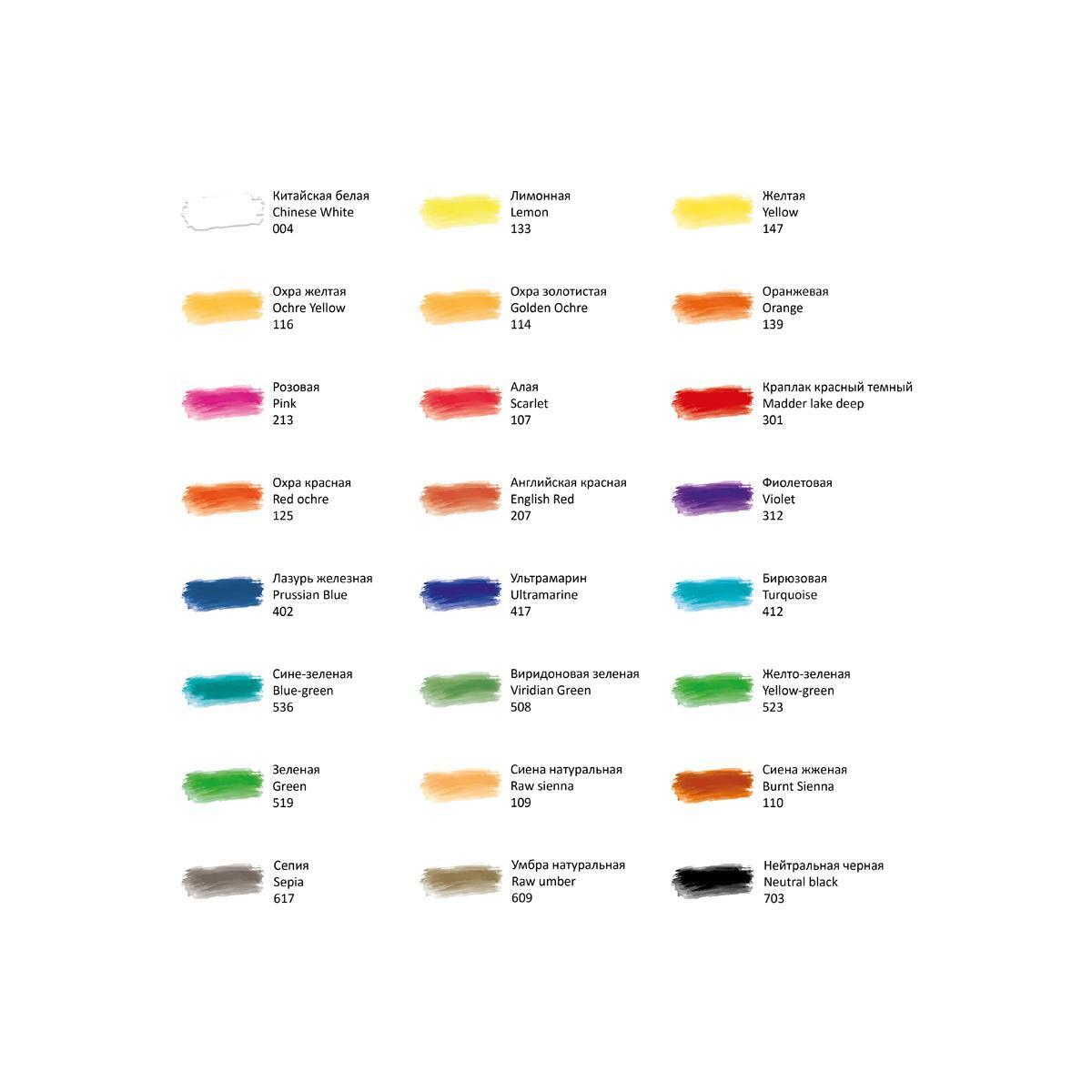 Студентам художественных школ, начинающим живописцам и всем, кто ценит удобство в работе. 24 базовых цвета включают как классические оттенки (умбра, сепия, охра), так и насыщенные тона (ультрамарин, бирюзовый, краплак).
