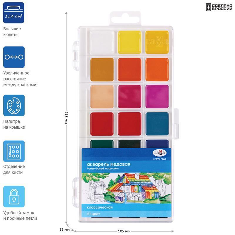 Акварель медовая "Классика", 21 цвет, яркие краски для творчества, в пластиковом пенале
