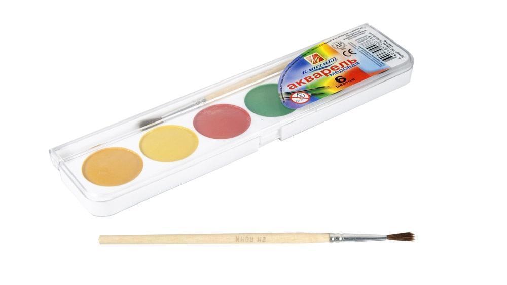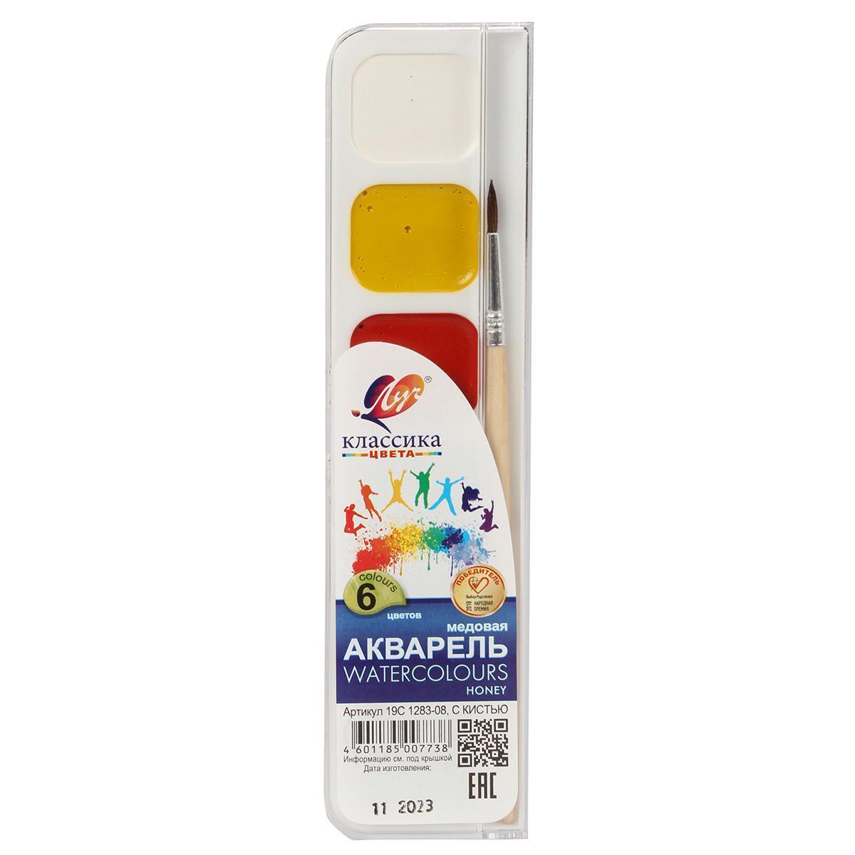 Акварель медовая "Классика", 6 цветов с кистью, яркие цвета, пластиковый пенал