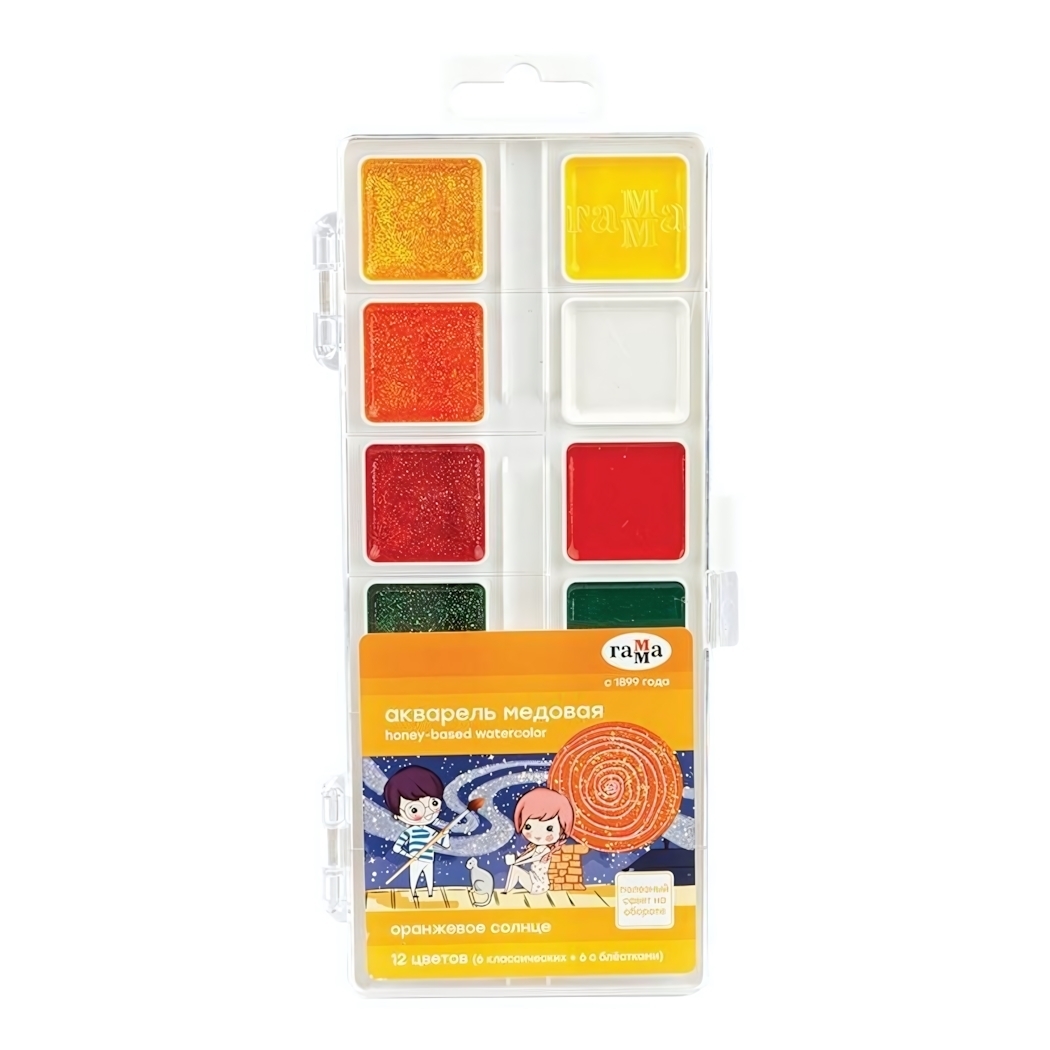 Акварель медовая Гамма "Оранжевое солнце", 12 цветов (6 с блестками), для детского творчества