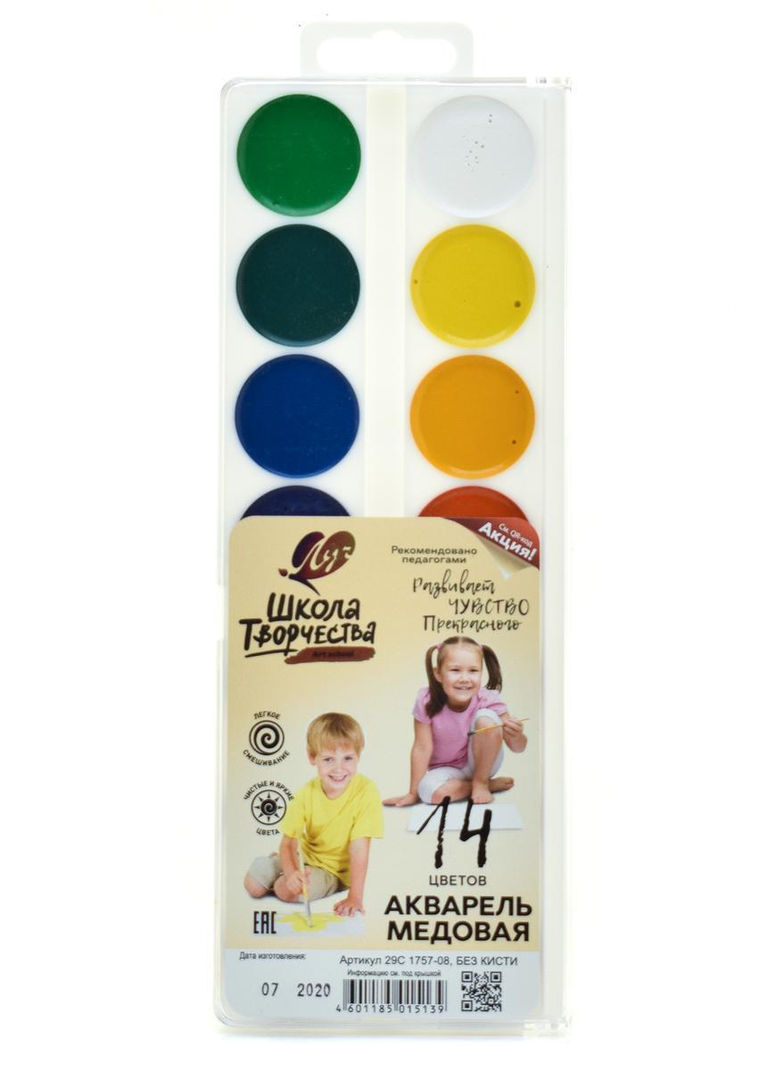 Акварель медовая "Школа творчества", 14 цветов, яркие оттенки, пластиковый корпус