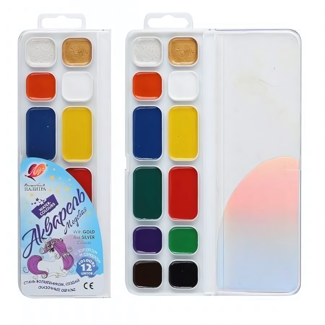 Акварель медовая «Волшебная палитра» 12 цветов с золотом и серебром, пластиковый контейнер
