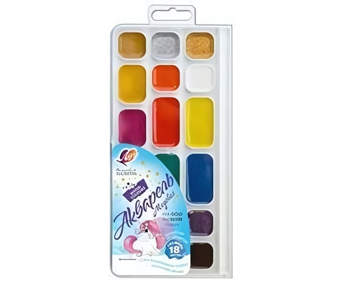 Пластиковый контейнер с 18 отделениями обеспечивает удобное хранение и переноску. Краска равномерно ложится на бумагу, сохраняя интенсивность пигмента после высыхания. Безопасный состав соответствует требованиям для детских художественных материалов.
