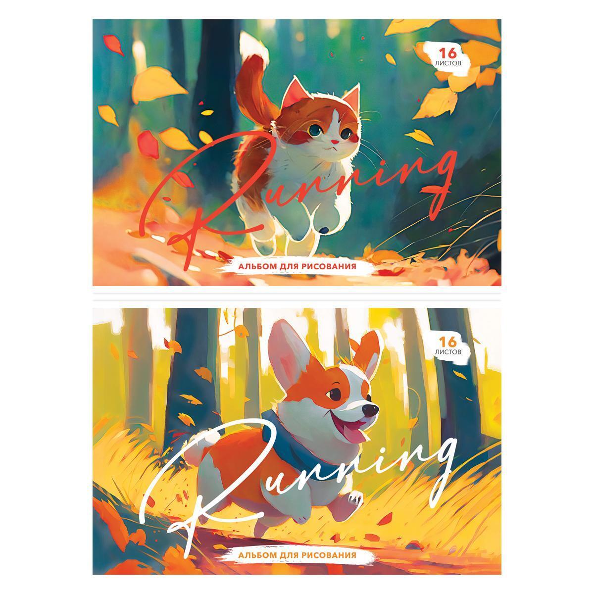 Альбом для рисования A4, 16 листов, "Питомцы.Running" (Спейс), яркие обложки с кошкой и корги