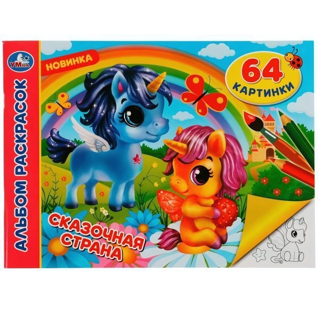 - 64 увлекательные картинки: Разнообразные иллюстрации с очаровательными персонажами сказочной страны, включая милых единорогов и их друзей.