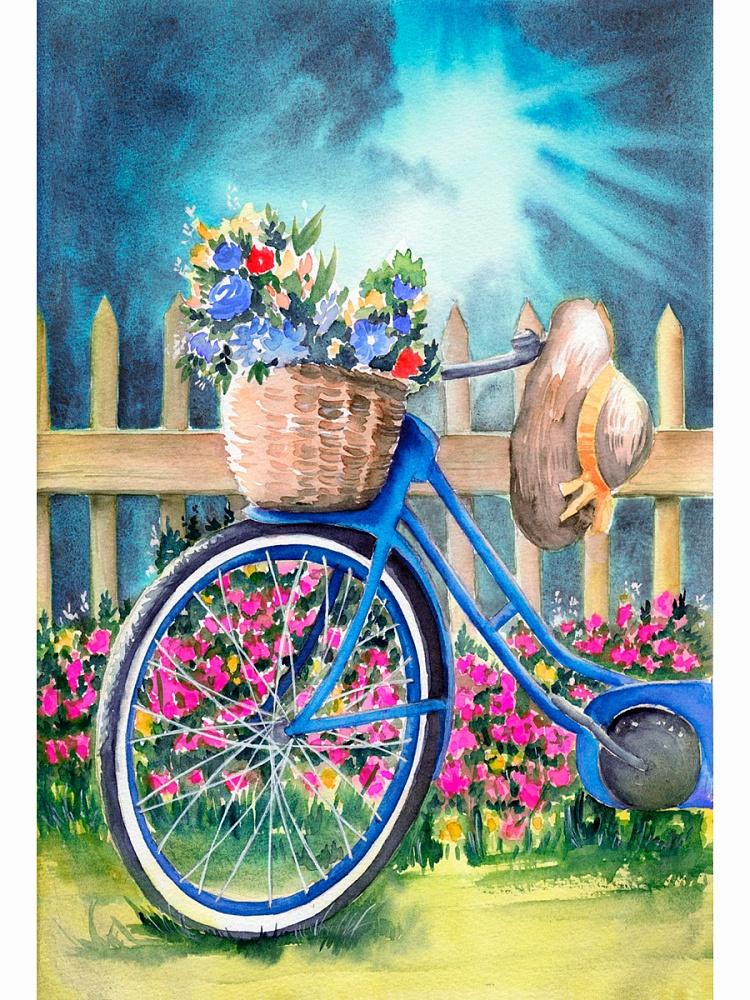 Центральный элемент композиции — ярко-синий велосипед с плетеной корзиной, наполненной разноцветными цветами. Изображение наполнено солнечным светом и уютом загородного сада. Детализированный рисунок со штакетником, соломенной шляпой и цветущими травами создает ощущение теплого летнего дня и дарит вдохновение во время работы.