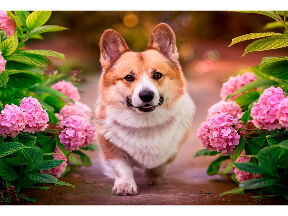 Блестящая алмазная мозаика с полным заполнением станет идеальным хобби для творческих натур. Готовое панно с изображением игривого корги среди цветущих гортензий добавит тепла и уюта в ваш дом.