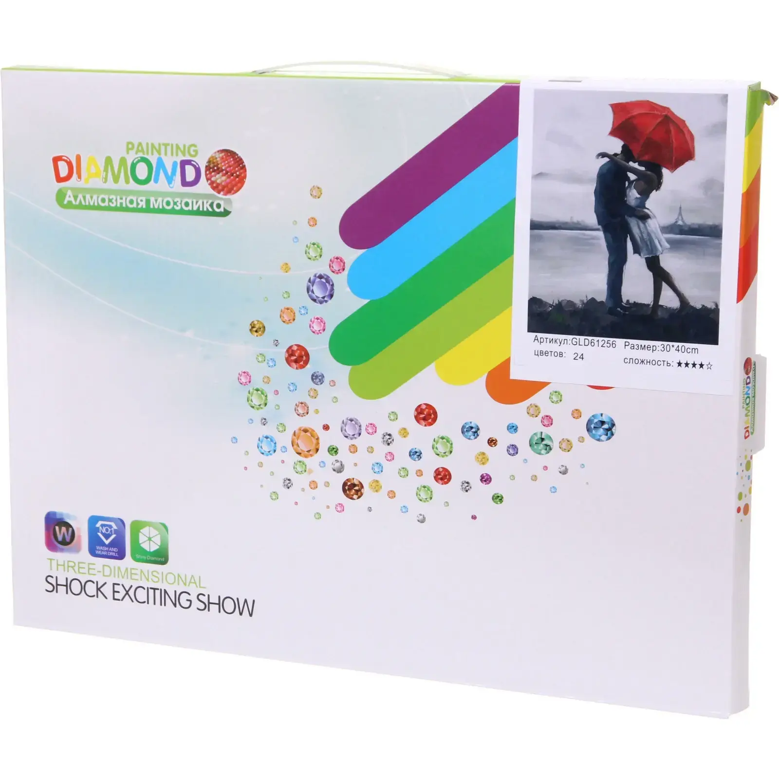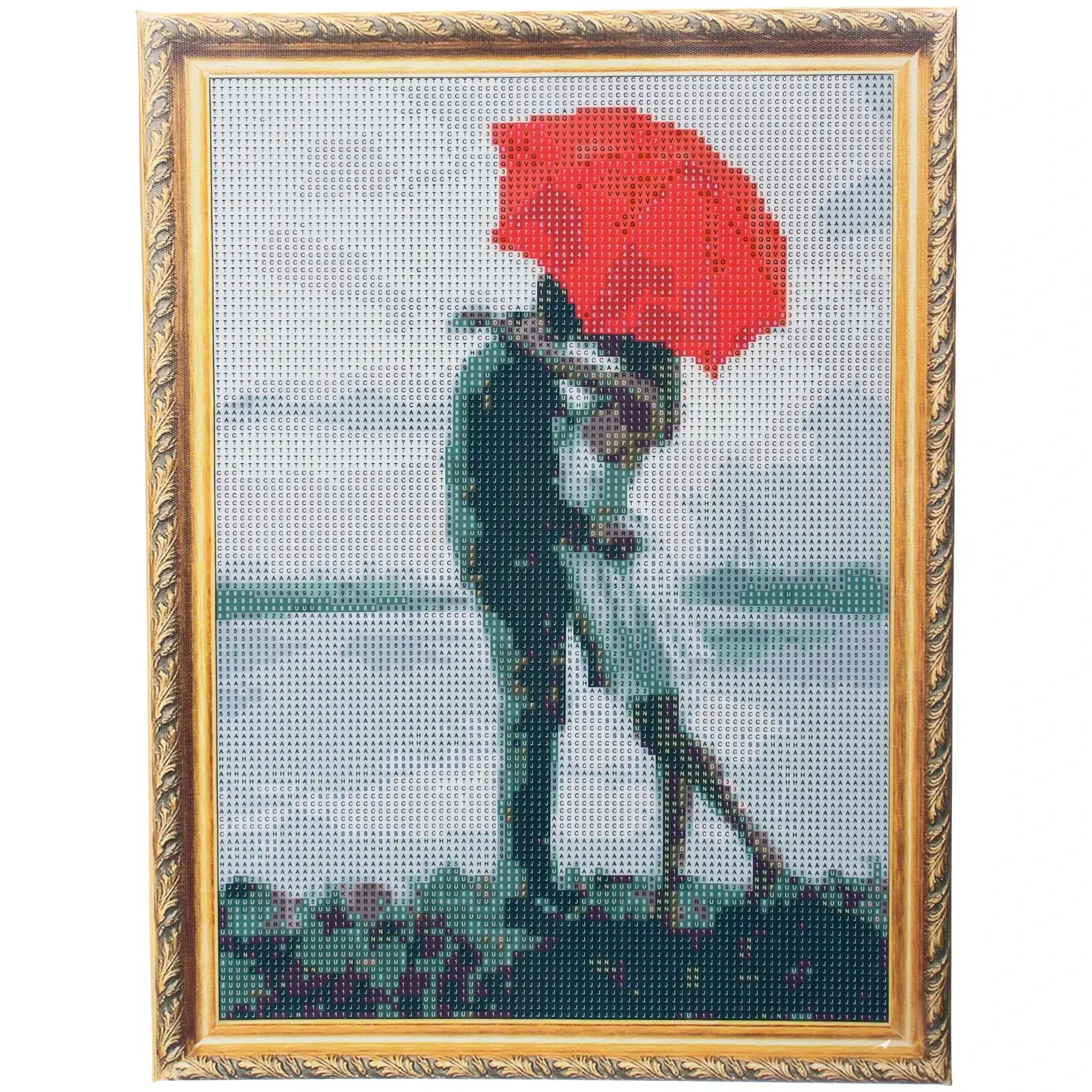 Готовая работа представляет собой романтическую сцену с парой под красным зонтом, выполненную в технике алмазной вышивки. Благодаря специальной технологии крепления страз, картина сохранит свой первоначальный вид долгие годы.
