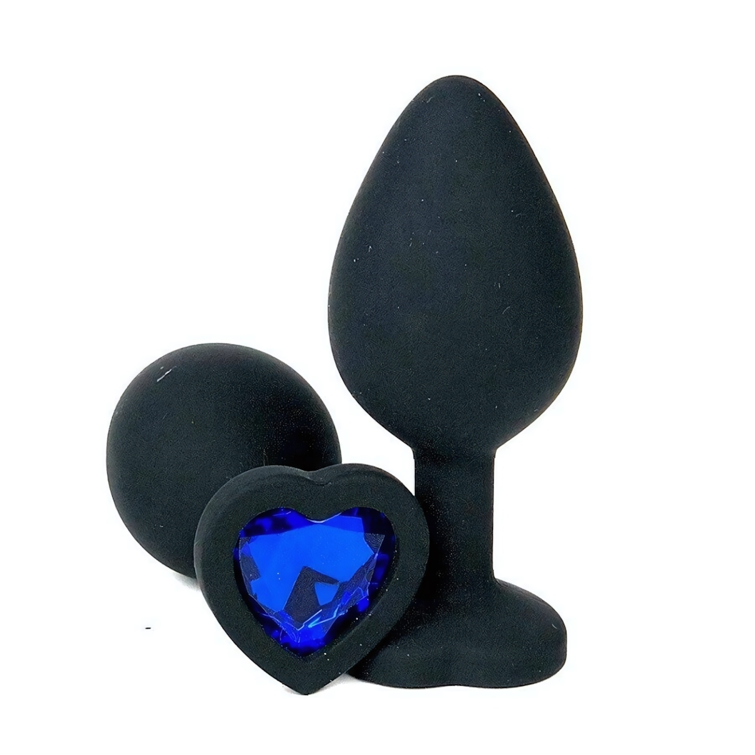 Анальная втулка Small, черная с синим кристаллом-сердцем, длина 7см, диаметр 2.8см