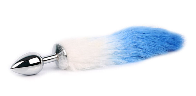 Анальная втулка с меховым хвостом, металл, 6,5 см, сине-белый, диаметр 2,7 см