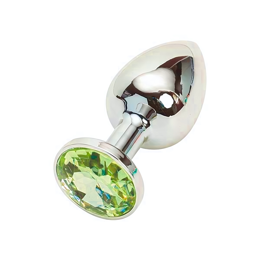 Металлическая пробка с кристаллом сочетает эстетику ювелирного украшения и функциональность интимного аксессуара. Гладкая поверхность из медицинской стали гарантирует безопасное использование, а эффектный зеленый камень добавляет изысканности вашим приватным моментам.