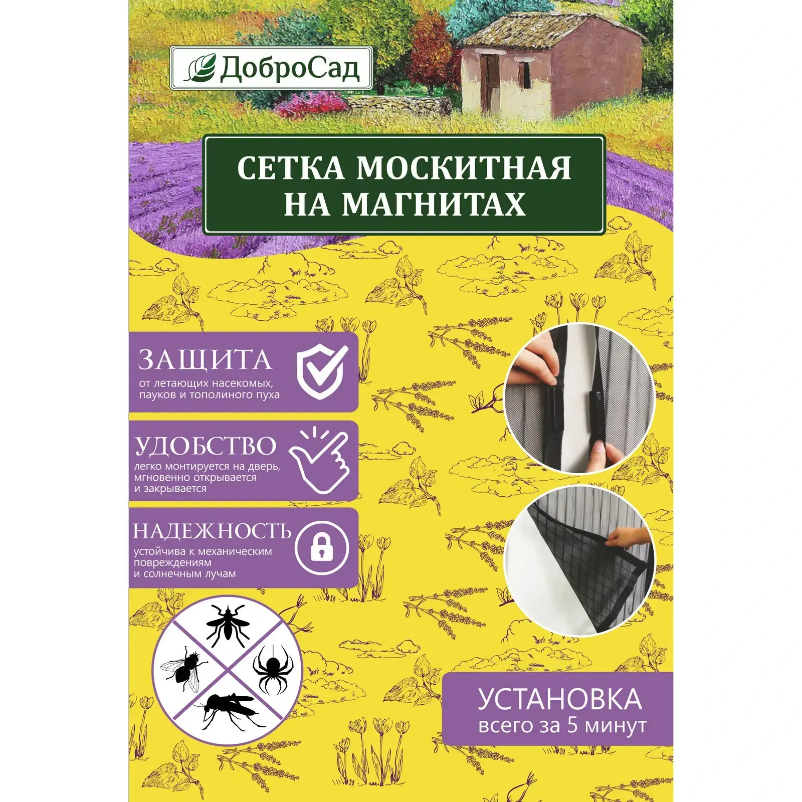 Сетка подходит для установки на любые двери, включая балконные и входные. Она изготовлена из прочного и устойчивого к воздействию солнечных лучей материала, что гарантирует долговечность и надежность. В комплекте с сеткой идет набор кнопок для крепления, что делает установку быстрой и простой — всего за 5 минут!
