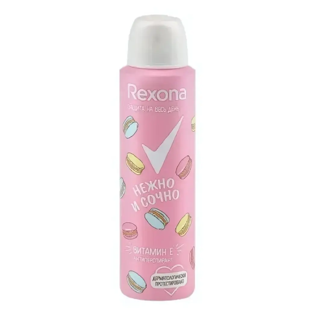 Объем упаковки составляет 150мл, что делает его удобным для использования дома и в поездках. Упаковка выполнена в яркой розовой цветовой гамме с изображениями макаронов, что добавляет нотку игривости и стиля. Антиперспирант Rexona 'Нежно/Сочно' — это ваш надежный помощник в борьбе с потоотделением и неприятными запахами.
