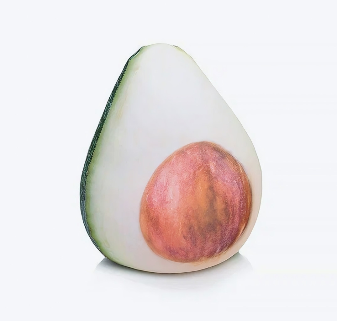 Игрушка изготовлена из экологичного полимера, полностью безопасного для детей и взрослых. Зелено-белый градиент с коричневой «косточкой» повторяет натуральные цвета спелого авокадо, создавая позитивные визуальные ассоциации.