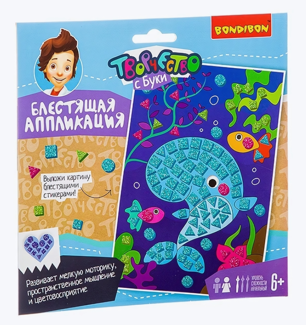 Погрузите ребенка в увлекательный мир подводных приключений с аппликацией "Кит" от Bondibon. Яркие блестящие элементы превратят процесс создания картины в настоящее волшебство.