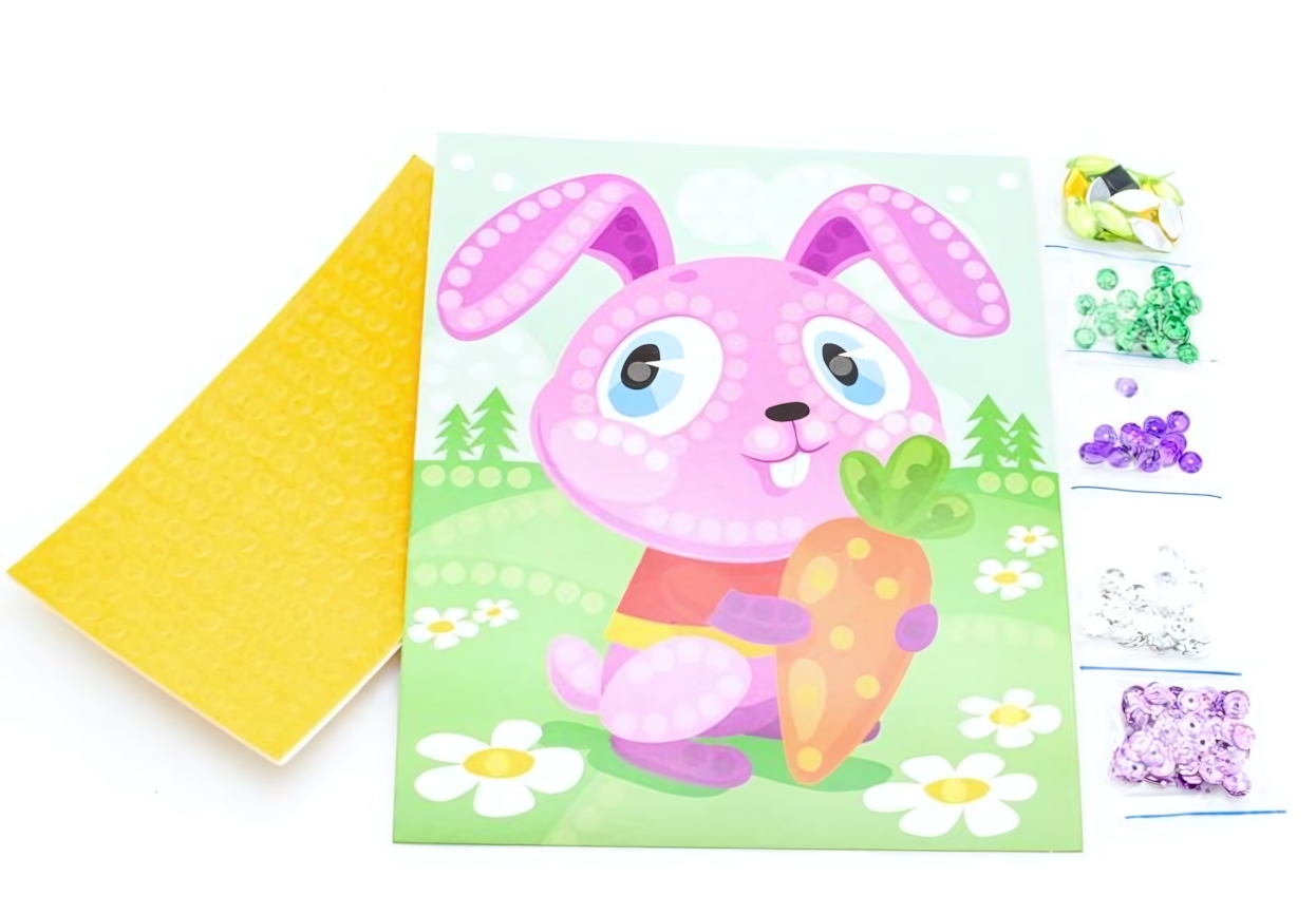 Создайте яркую картинку с забавным кроликом, используя разноцветные пайетки и стразы. Этот набор для творчества превращает процесс декорирования в увлекательную игру.