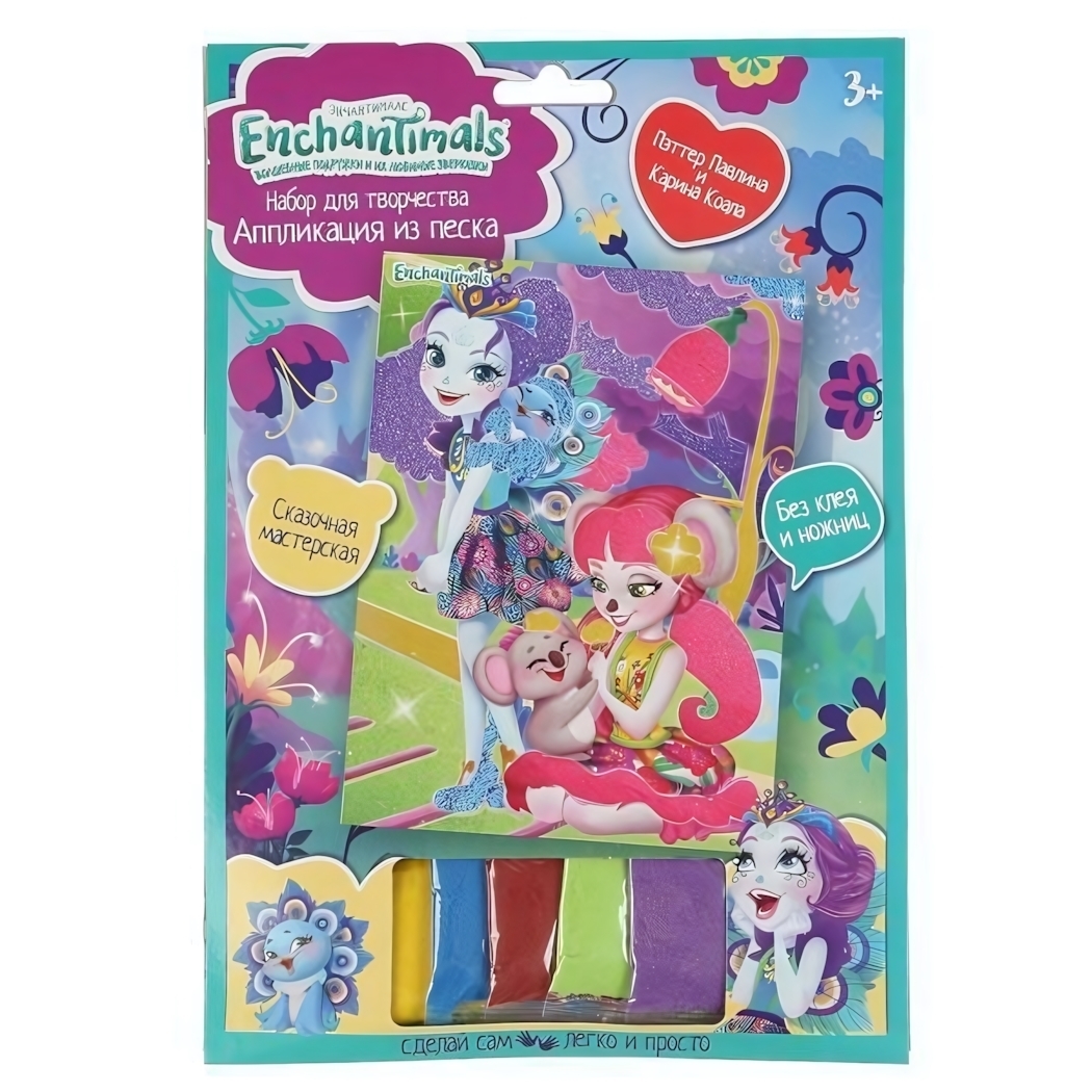 - Яркие цвета и любимые герои: В наборе представлены 5 различных цветов песка и основа с изображением персонажей "Enchantimals", что позволит создать уникальную аппликацию.