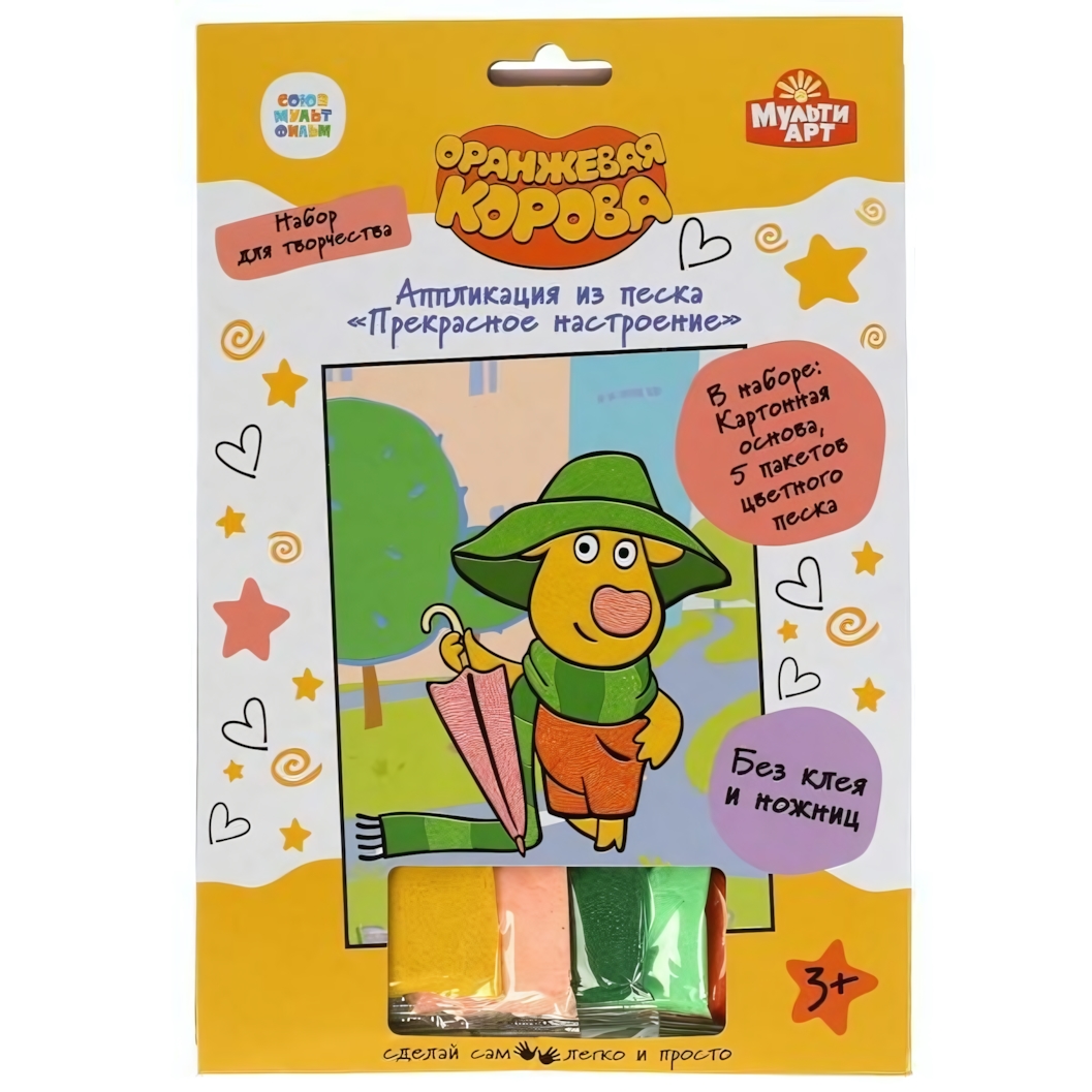 Создавайте яркие моменты вместе с аппликацией из песка 'Оранжевая Корова'. Этот набор станет не просто развлечением, но и полезным занятием, которое увлечёт вашего малыша.