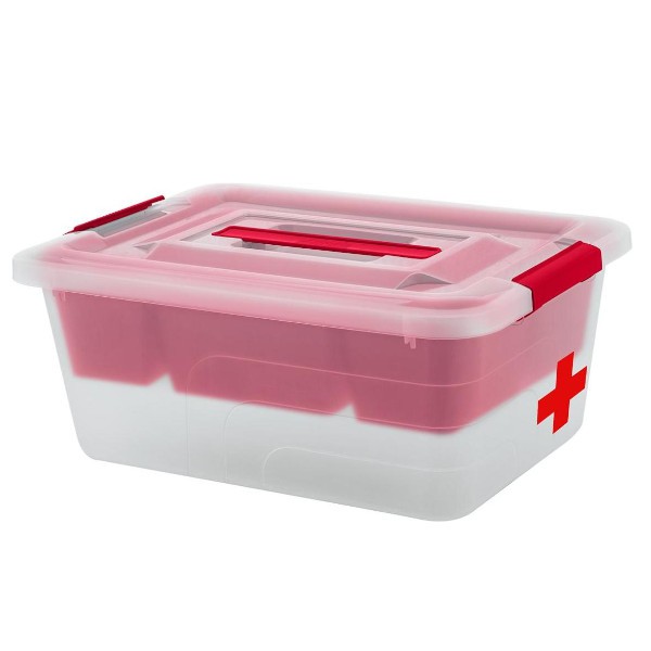 Контейнер прямоугольной формы с полупрозрачной крышкой и красными акцентами (защёлки, лоток, ручка) выглядит аккуратно и современно. Яркий красный крест на боковой стенке сразу обозначает назначение ёмкости. Объёма 13 литров достаточно для комплектации полноценной домашней аптечки для всей семьи. Контейнер поможет навести порядок в разрозненных упаковках с лекарствами, собрать всё в одном месте и всегда знать, что под рукой есть всё необходимое для оказания первой помощи.