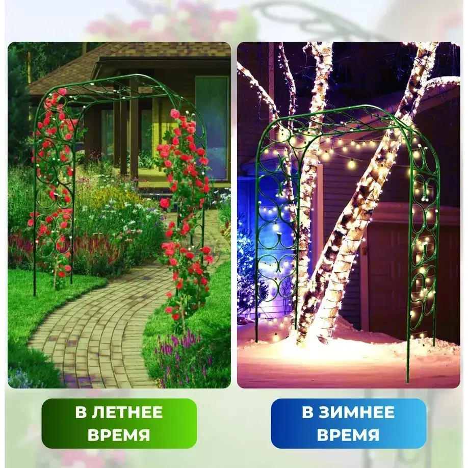 - Легко устанавливается и подходит для любого сезона — летом она может быть украшена цветами, а зимой — огоньками.