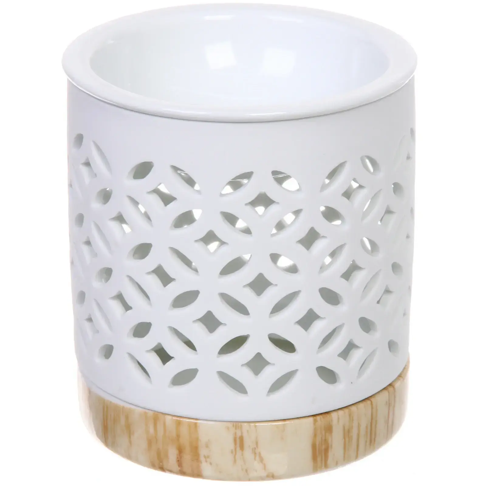 Эта ароматическая лампа сочетает в себе изысканный дизайн и практичность, создавая атмосферу тепла и гармонии в любом помещении. Её утончённая керамическая поверхность с аккуратным геометрическим узором дополняется элегантной вставкой под дерево, которая придаёт изделию особый шарм. Белый цвет корпуса универсален и легко гармонирует с любым интерьером.