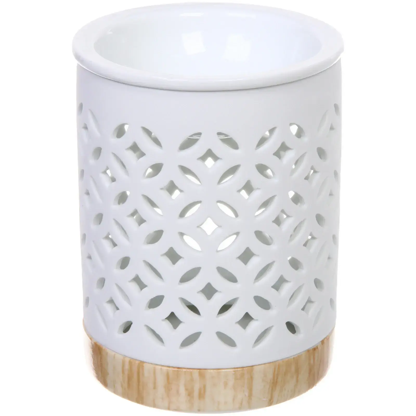 Эта изящная аромалампа из керамики с декоративными ажурными вырезами создаёт атмосферу тепла и уюта, наполняя пространство приятными нотами эфирных масел. Её белоснежный корпус с утончённым орнаментом гармонично сочетается со светлым деревянным основанием, что делает аксессуар не только функциональным, но и стильным элементом интерьера.