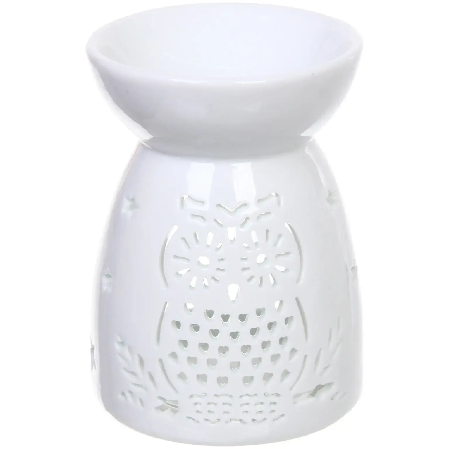 Создайте атмосферу тепла и уюта в вашем доме с керамической аромалампой «Мудрая сова». Её изысканный дизайн с ажурными вырезами в форме совы, звёзд и растительных мотивов не только радует глаз, но и наполняет пространство мягким светом от свечи, создавая неповторимую атмосферу. Белая керамика легко вписывается в любой интерьер, а плавные линии формы подчёркивают утончённость изделия.