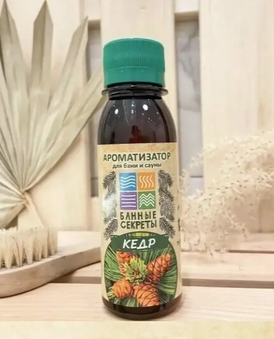 Ароматизатор представлен в темно-коричневом флаконе с зеленой крышкой, украшенном яркой этикеткой с изображениями сосновых шишек и хвои. Его стандартный размер делает его идеальным для хранения в любом месте. Не упустите возможность сделать ваши банные процедуры еще более приятными и расслабляющими с ароматизатором «Кедр»!