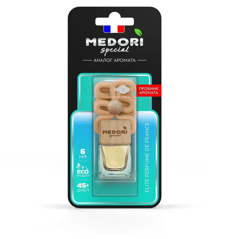 Ароматизатор поставляется в герметичной упаковке с подробной инструкцией. Объём парфюмированного концентрата — 6 мл (хватает на 1.5 месяца использования). Силиконовый держатель устойчив к перепадам температур от -30°C до +80°C. Надпись «MEDORI special» на декоративном элементе подтверждает оригинальность продукции.