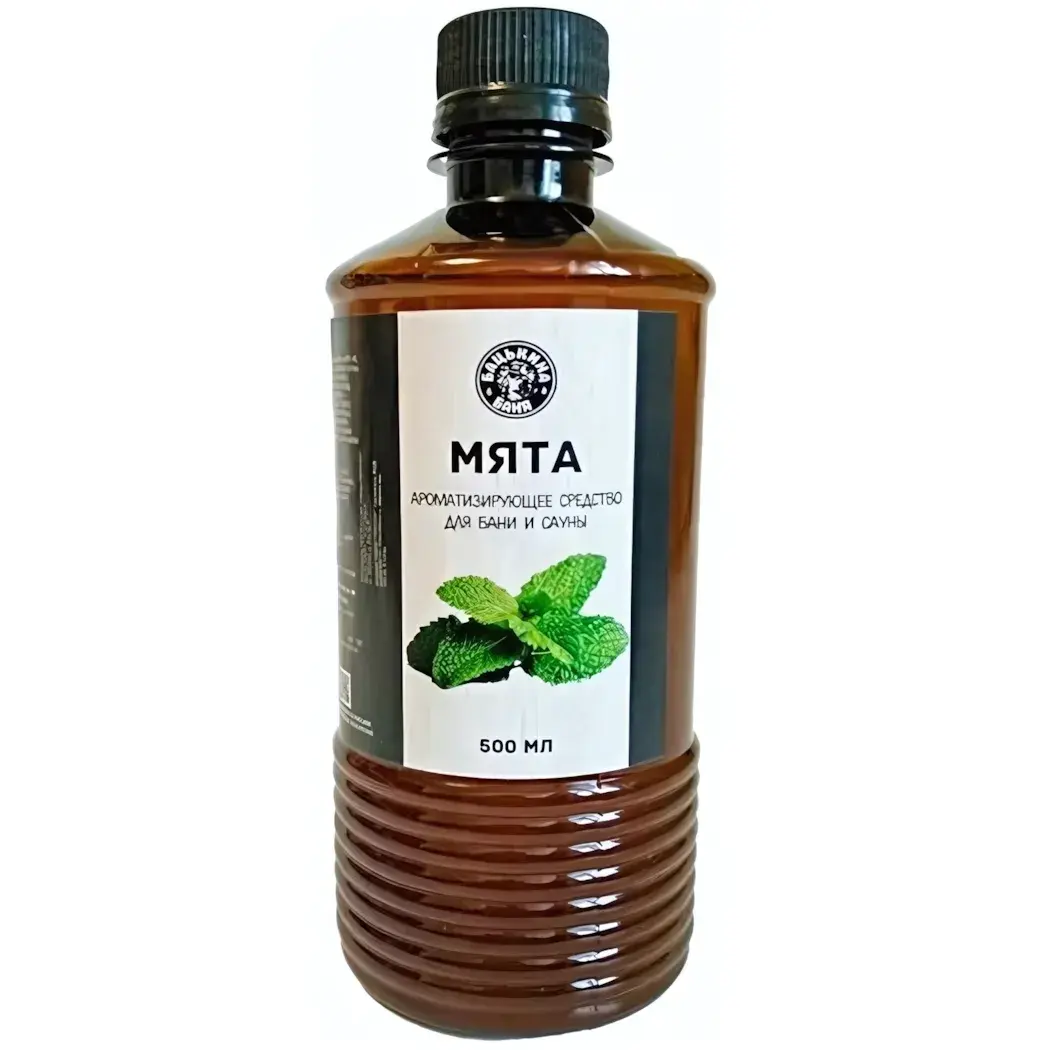 Ароматизатор имеет коричневый цвет и выполнен в форме вертикально вытянутой бутылки. На этикетке изображены листья мяты, что подчеркивает натуральность продукта. Объем бутылки составляет 500 мл, что делает его идеальным выбором для регулярного использования в бане или сауне.