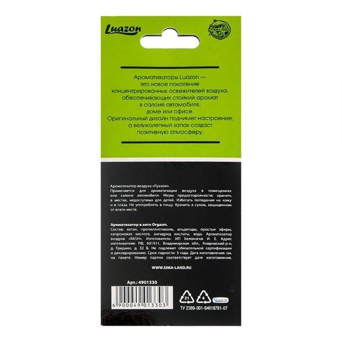 Цвет ароматизатора — зеленый, что добавляет свежести и яркости в интерьер. Он станет отличным дополнением к любому стилю оформления. Не упустите возможность сделать свой автомобиль более уютным и стильным с ароматизатором «Orgasm»!
