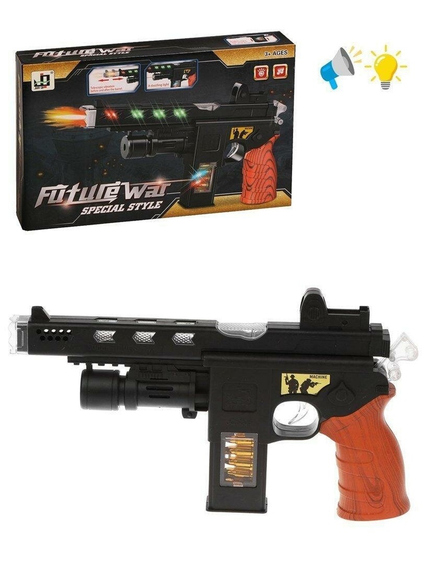Размер 28х3х16 см оптимален для детей от 3 лет. Оранжевые акценты на черном корпусе соответствуют требованиям безопасности для игрушечного оружия. Для активации эффектов достаточно нажать спусковой крючок — интуитивно понятное управление без сложных инструкций.