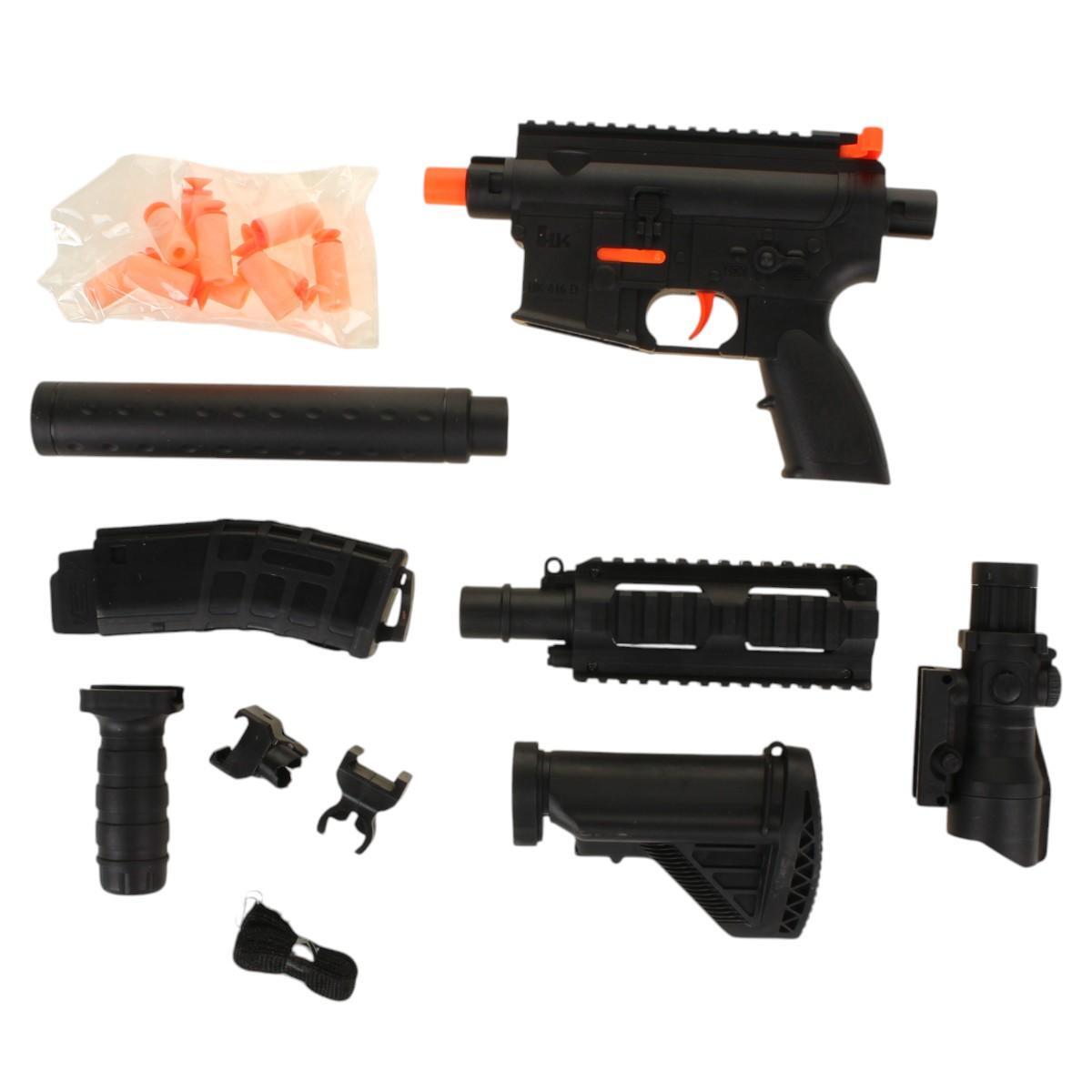 Разборная конструкция с тактическими аксессуарами и мягкими патронами подарит ребёнку увлекательный игровой опыт без риска травм. Идеально подходит для сюжетно-ролевых игр и развития моторики у детей от 6 лет.