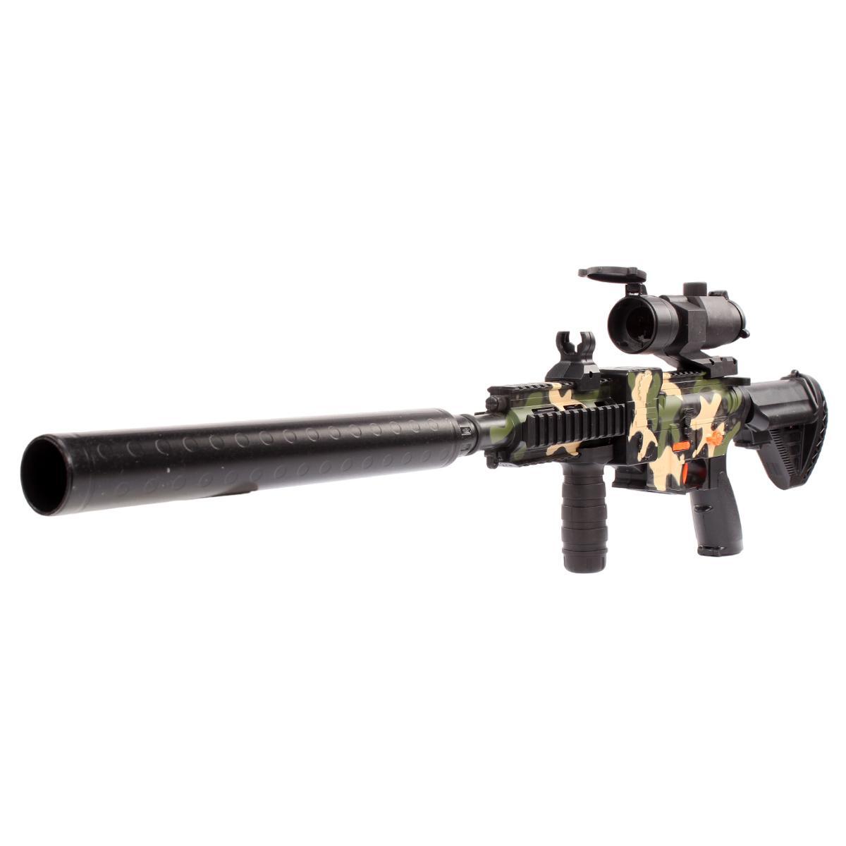 - Реалистичный дизайн с камуфляжным принтом и тактическими элементами (оптический прицел, съёмный глушитель)