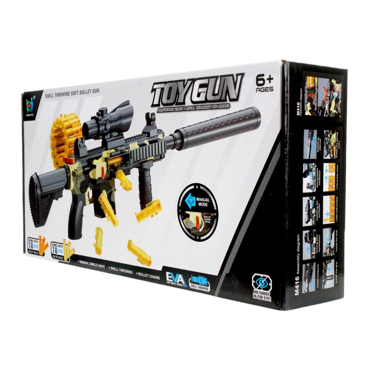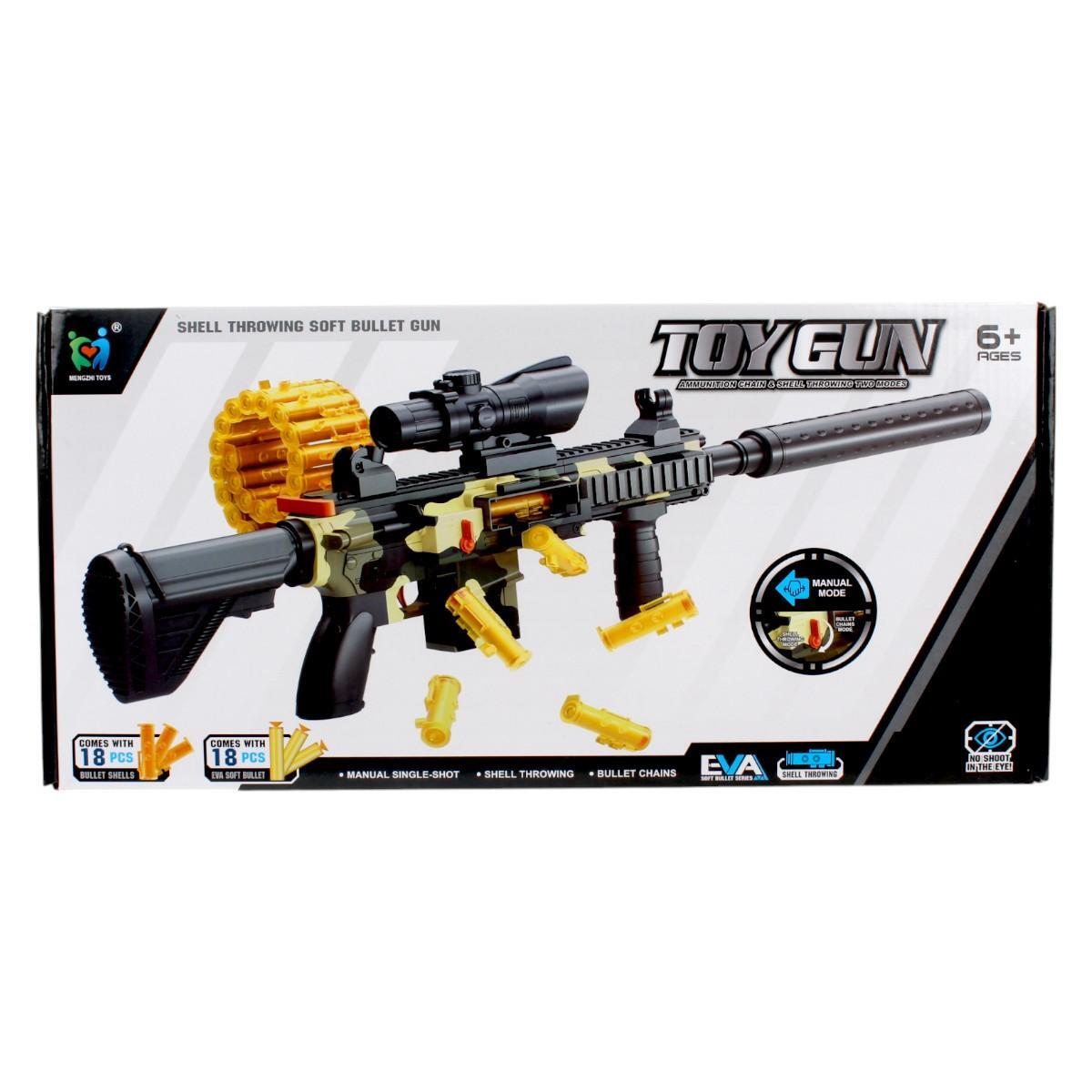 Набор для ролевых игр с разборным автоматом и пистолетом развивает воображение и координацию движений. Безопасные мягкие пули (18 шт) и гильзы позволяют устраивать захватывающие сражения без риска травм.