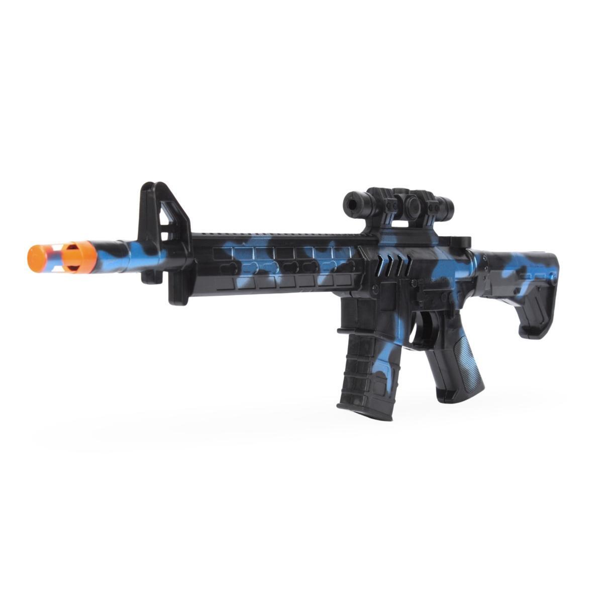 Модель размером 66 см повторяет форму настоящего оружия с точностью до деталей: тактический приклад, удобная пистолетная рукоятка и съёмный прицел. Чёрно-синий камуфляж с декоративными элементами создаёт эффект боевого снаряжения.