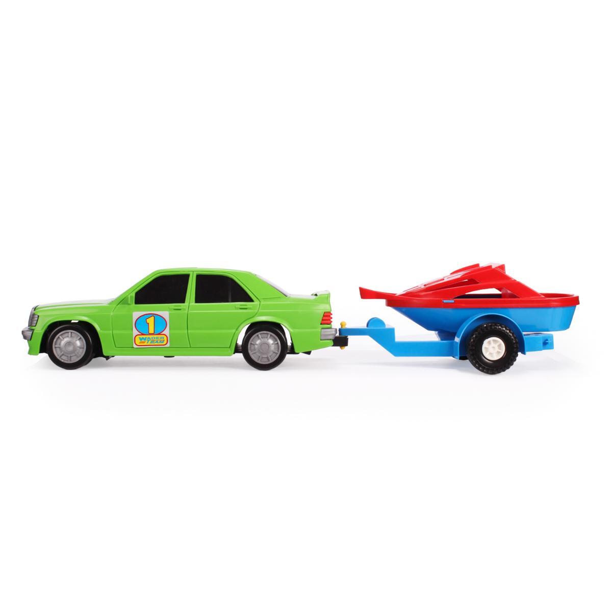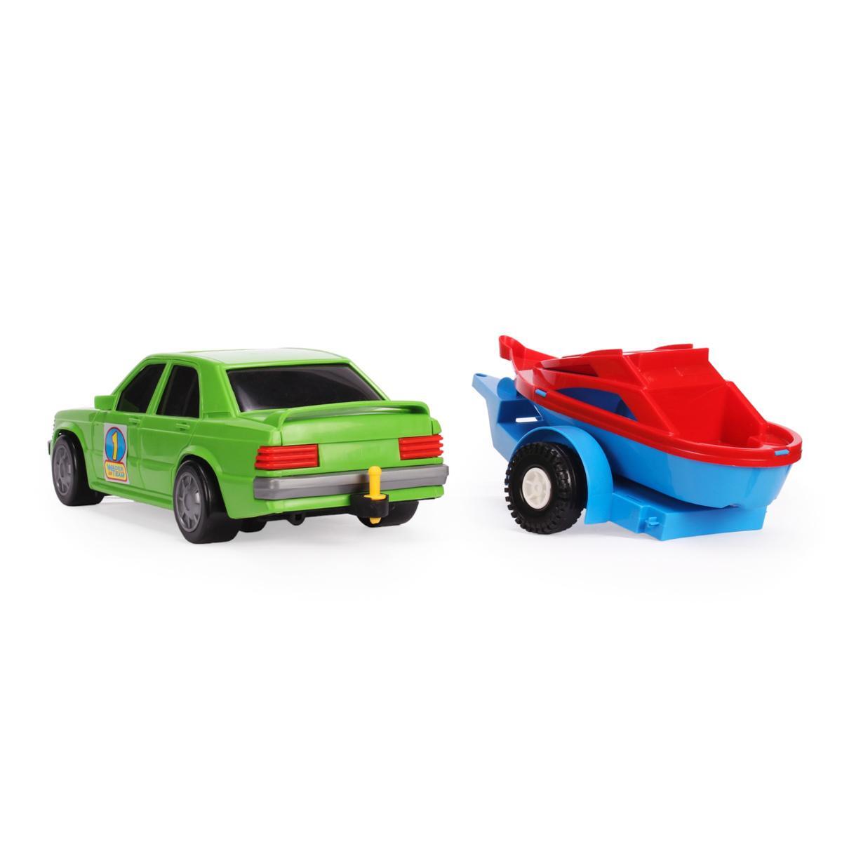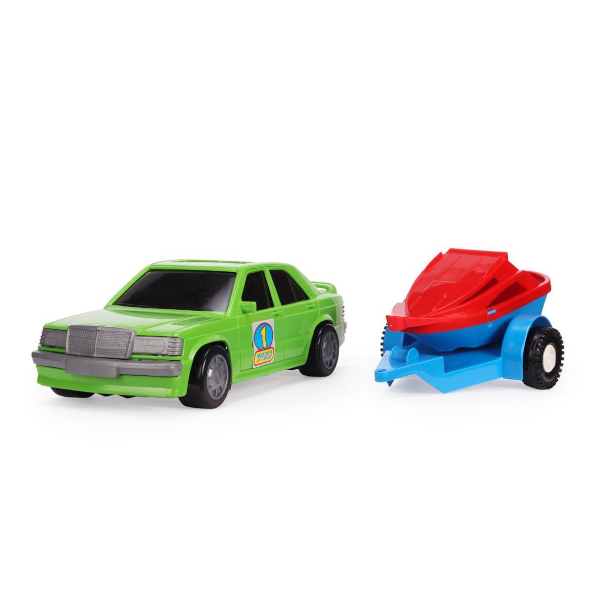 Автомобиль имеет форму классического легкового автомобиля с черными колесами и серебристой решеткой радиатора. Прицеп окрашен в голубой цвет и оснащен красной лодкой, что делает его привлекательным для детей. Размеры игрушки не указаны, но она подходит для стандартных игровых наборов. 'Авто-мерс' станет отличным подарком для любого ребенка, который любит автомобили и приключения!