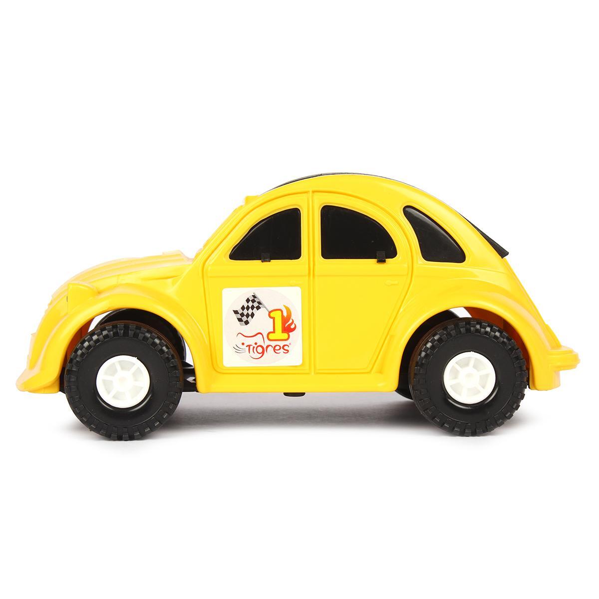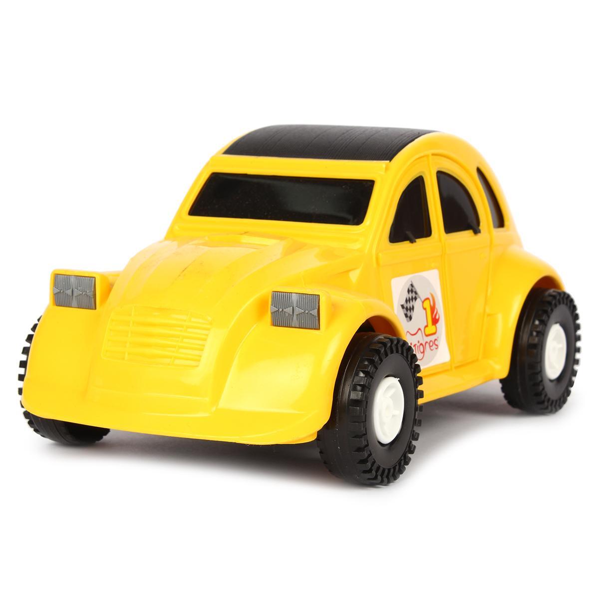 Автомобиль представлен в ярком желтом цвете с черной крышей и колесами. Его размеры идеально подходят для маленьких ручек, а гладкая поверхность делает его удобным для игры. На боковой стороне автомобиля есть наклейка с изображением флага и номером '1', что добавляет элемент игры и соревнования. 'Авто-жучок' — это не просто игрушка, а целый мир приключений для вашего ребенка!